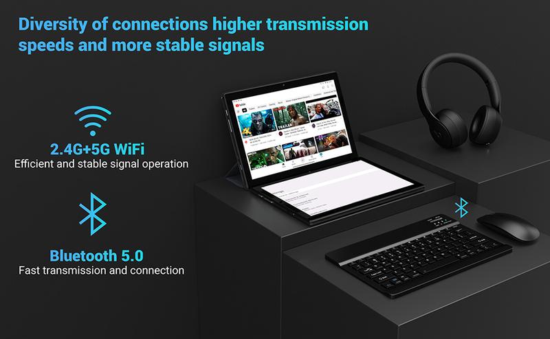 【5G /2.4G WiFi + Bluetooth 5.0】 The tablet supports 2.4Ghz +5Ghz Wi-Fi with new Wi-Fi receiving and transmitting channels that improve the speed and stability of the network connection. The tablet is also equipped with Bluetooth 5.0 technology to connect Bluetooth headsets, Bluetooth keyboards and other Bluetooth devices, making it more convenient for daily work, study, etc. (This product only supports the use of WiFi networks and mobile hotspot networks; it does not support the use of SIM card networks)