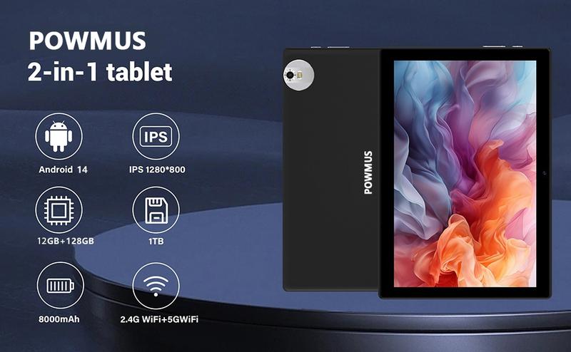 POWMUS Tablet 10 Inch Newest Android Tablet 14 with Keyboard Mouse, Case, Stylus, 12GB RAM + 128GB ROM (TF 1TB), 5G Wifi, Quad-Core 2.0Ghz, 8000Mah, Dual Camera, 8MP+5MP, Bluetooth, Android Quad-Core 2-In-1 Tablet