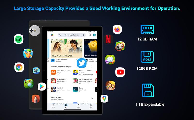 【12GB Physical RAM + 128GB ROM + 1TB ROM Expansion】 The tablet is equipped with an internal memory of 12GB Physical RAM | 128GB ROM | Smooth Multitasking Performance. The SD card can be expanded up to 1TB of memory. It supports storing a large number of applications, photos, videos, music and documents, etc. At the same time, it can launch applications and videos quickly and smoothly, rejecting the caton.