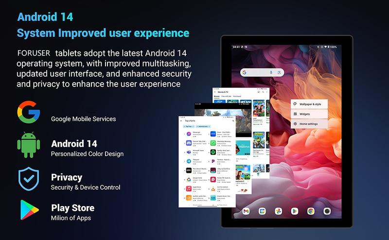 【Latest Android 14】The tablet is equipped with the latest Android 14 system with enhanced privacy and security for better control of privacy and data. Thanks to a powerful 2.0GHz processor, the operation and stability are significantly improved, for a faster user experience.