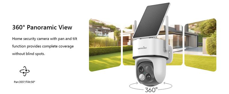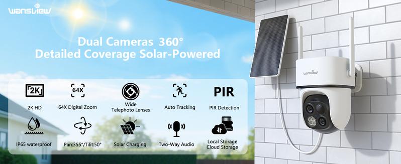 Wansview 2.4Ghz Wifi Wireless Outdoor Solar Camera,Dual Lens & 3.6Mm Wide-Angle & 64X Digital Zoom,360°Ptz, Solar Panel/Battery Powered, PIR Detection, 2K Color Night Vision, Sd/Cloud Storage (Optional), Works with Alexa